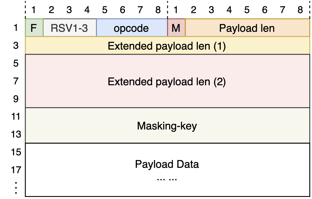 - WebSocket 协议中数据传输的单位为帧(Frame),每帧能够携带的最大数据量为 264 − 1 字节