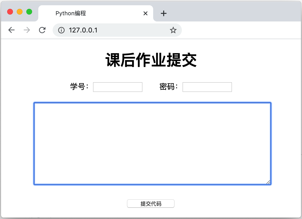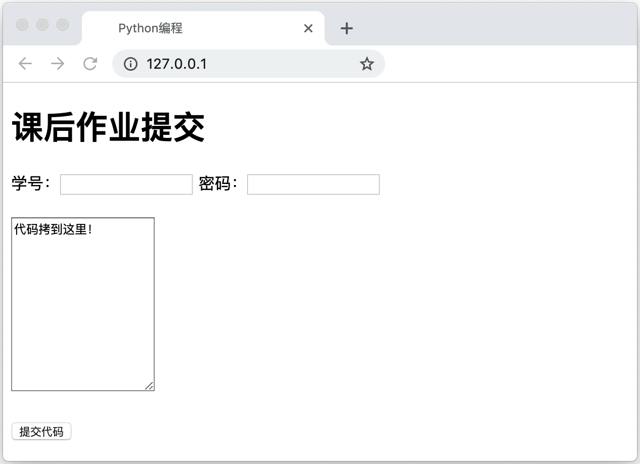 <!DOCTYPE html> <html> <head> <meta charset="UTF-8"> <title>Python编程</title> </head> <body> <div class="continer"> <div class="box"> <h1>课后作业提交</h1> <form action="/" method="post" accept-charset="utf-8"> <div> <span>学号:</span><input type="text" name="usertag" /> <span></span> <span>密码:</span><input type="password" name="password" /> </div> <br> <div> <textarea name="code" id="codebox" rows="10" wrap="off"> 代码拷到这里! </textarea> </div> <br> <div> <input type="submit" value="提交代码" /> </div> </form> </div> <br> </div> </body> </html> -
